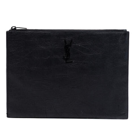 The pre-owned Saint Laurent Croc Embossed Leather Monogram Clutch is a sophisticated accessory that brings timeless elegance to any wardrobe. Crafted from croc-embossed leather, this designer clutch showcases the iconic Saint Laurent aesthetic with a sleek silhouette, top zip closure, and interior slip pockets for added convenience. Its compact yet refined design makes it an excellent choice for carrying your essentials with luxury and contemporary style.<br /><br /> Designed for both fashion and functionality, this Saint Laurent clutch offers a polished way to organize your daily necessities while elevating both casual and evening looks. Measuring approximately 8.07 inches in height, 11.22 inches in width, and 0.39 inches in depth, it is perfectly sized to hold small essentials without feeling bulky. The interior slip pockets provide added organization, making it perfect for everyday use.<br /><br /> This authentic pre-owned Saint Laurent handbag is a stylish option for buyers seeking designer quality at a better value. Model: Croc Embossed Leather Monogram Clutch. Item# IG1BUCPLJO80IOAL. Inclusions: None. Rating: B+. Condition for pre-owned: Exterior Bottom Worn. Exterior Corners Worn. Exterior Front Worn, Stained With Others. Exterior Side Worn. Exterior Top Worn. Zipper Scratched. Interior Lining Stained With Others, Worn. This is a great opportunity to own an authentic handbag at a more accessible price.