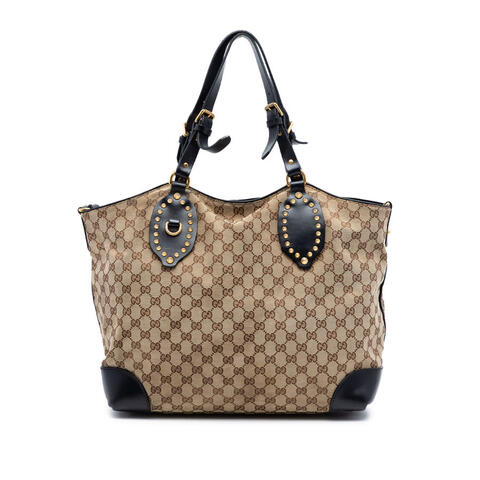 The Gucci GG Canvas Patti Studed Hobo is a chic and versatile designer handbag that blends signature style with everyday practicality. Crafted with a durable canvas body and accented by studded leather trim, this pre-owned Gucci bag offers a refined silhouette with adjustable flat leather handles, an open top with a lobster clasp closure, and interior zip and slip pockets for organized storage. With dimensions of 13.39 x 14.57 x 5.51 inches, it provides ample space while maintaining a fashionable profile, making it an excellent choice for anyone seeking luxury and contemporary style.<br /><br /> Designed for both fashion and functionality, this authentic Gucci GG Canvas Patti Studed Hobo delivers the ideal balance of elegance and convenience. Its spacious interior and smart pocket layout make it easy to carry daily essentials, while the iconic Gucci design adds a sophisticated touch to any wardrobe. Whether paired with casual daytime looks or elevated evening outfits, this stylish pre-owned handbag is perfect for everyday use.<br /><br /> This pre-owned Gucci handbag is rated Condition B+ and remains a desirable option for buyers who appreciate authentic designer pieces with character. Comments: Exterior Back Stained With Others, Stained With Transfer of Color. Exterior Side Scratched. Hardware Practical Attachment Scratched. Exterior Bottom Worn, Stained With Others, Scratched. Exterior Corners Worn. Interior Lining Stained With Others. Exterior Front Stained With Transfer of Color, Stained With Others. Exterior Top Worn. Hardware Embellishment Scratched. Exterior Handle/Strap Worn. Interior Pocket Stained With Others. Zipper Scratched. Inclusions: None. Model: GG Canvas Patti Studed Hobo. Item# CRSGJJ3YGGCDNEQG. This is a great opportunity to own an authentic handbag at a more accessible price.