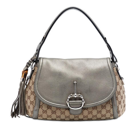 Pre-owned Gucci Medium GG Canvas Techno Horsebit Satchel Ladies 64AU897XPATPJ0R8 is a chic and timeless designer handbag that blends signature Gucci heritage with modern appeal. Crafted with a durable GG canvas body, leather trim, and distinctive bamboo tassel detail, this satchel offers an elevated look that complements both casual and polished outfits. The structured silhouette, front flap with magnetic snap closure, and iconic Horsebit-inspired styling make it a standout accessory with luxury and contemporary style.<br /><br /> Designed for both fashion and functionality, this Gucci satchel features flat leather handles, a detachable flat leather strap, and a thoughtfully organized interior with zip and slip pockets to help keep essentials secure and accessible. Measuring approximately 8.27 x 13.78 x 5.12 inches, it offers a practical size for carrying daily necessities while maintaining a refined designer look. Complete with a dust bag and charm, this authentic Gucci handbag is a versatile addition to any collection and is perfect for everyday use.<br /><br /> This pre-owned Gucci Medium GG Canvas Techno Horsebit Satchel is an excellent choice for buyers seeking authentic luxury at a more approachable value. Condition Rating: B+. Comments: Exterior Back Scratched. Exterior Corners Worn. Exterior Handle/Strap Worn, Split, Creased. Exterior Top Creased, Worn. Hardware Closure Scratched. Hardware Practical Attachment Scratched. Zipper Scratched. Interior Lining Stained With Others, Creased. Inclusions: Dust bag, Charm. Model: Medium GG Canvas Techno Horsebit Satchel. Item# 64AU897XPATPJ0R8. This is a great opportunity to own an authentic handbag at a more accessible price.