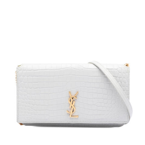Pre-owned Saint Laurent Croc Embossed Leather Monogram Cassandre Crossbody Ladies 7G1WCQXEBE2M8UEA is a chic designer handbag that blends timeless elegance with a modern edge. Crafted with an embossed leather body, this Saint Laurent crossbody bag features a gold-tone chain with a leather strap, a front flap with magnetic closure, an exterior back slip pocket, and an interior slip pocket for stylish organization. Its compact silhouette and iconic Monogram Cassandre design make it a standout accessory for day or evening wear, offering luxury and contemporary style.<br /><br /> Designed for both fashion and functionality, this authentic Saint Laurent crossbody is an excellent choice for carrying your essentials in a refined and versatile way. Measuring approximately 4.33 x 6.89 x 0.79 inches, it offers a sleek profile while still providing convenient storage with its exterior and interior slip pockets. Whether paired with casual daytime looks or elevated evening outfits, this designer handbag delivers signature sophistication and is perfect for everyday use.<br /><br /> Condition Rating: B+. Comments: Exterior Back Worn. Exterior Bottom Worn. Exterior Corners Worn. Exterior Front Stained With Others. Exterior Handle/Strap Worn, Creased, Scratched. Exterior Pocket Stained With Others. Exterior Side Cracked. Exterior Top Worn. Hardware Closure Scratched. Hardware Practical Attachment Scratched. Inclusions: None. Model: Croc Embossed Leather Monogram Cassandre Crossbody. Item# 7G1WCQXEBE2M8UEA. This pre-owned Saint Laurent handbag is a smart option for shoppers seeking authentic luxury, signature craftsmanship, and designer appeal in one sophisticated piece. This is a great opportunity to own an authentic handbag at a more accessible price.