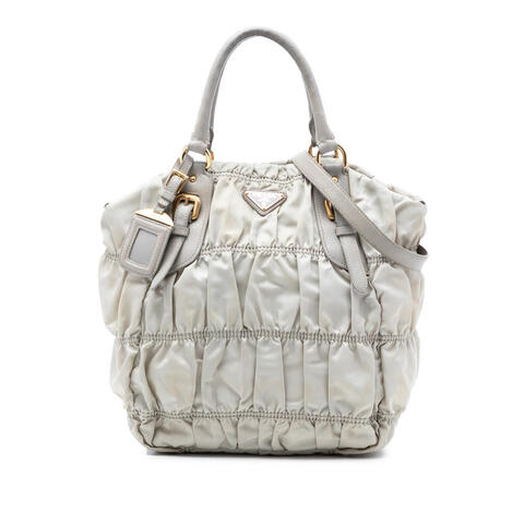 The pre-owned Prada Tessuto Gaufre Satchel is a chic and versatile designer handbag that blends signature Prada craftsmanship with timeless appeal. Crafted with a gathered nylon body, elegant gold-tone hardware, rolled leather handles, and a detachable flat leather strap, this satchel offers both sophistication and convenience in one refined silhouette. Its top magnetic closure and spacious interior with zip and slip pockets make it a stylish choice for carrying your daily essentials with luxury and contemporary style.<br /><br /> Designed for both fashion and functionality, this Prada satchel is an excellent choice for anyone seeking a lightweight yet polished handbag for day-to-day wear. The classic Tessuto Gaufre design adds texture and designer character, while the practical structure makes it easy to transition from casual outings to more elevated occasions. With included accessories such as the name tag and shoulder strap, this handbag is as adaptable as it is fashionable, making it perfect for everyday use.<br /><br /> This authentic pre-owned Prada Tessuto Gaufre Satchel measures 12.20 x 10.63 x 5.12 inches and is identified by Model: Tessuto Gaufre Satchel, Item# P6RC7C2PV25PQNNC. Condition Rating: B+. Comments: Exterior Back Stained With Others, Worn. Exterior Bottom Stained With Others. Exterior Front Stained With Others. Exterior Handle/Strap Stained With Others, Worn. Exterior Side Stained With Transfer of Color, Stained With Others. Exterior Top Cracked, Worn. Hardware Closure Scratched. Hardware Practical Attachment Scratched. Zipper Scratched. Interior Lining Worn, Stained With Others. Inclusions: Name tag, Shoulder Strap. This is a great opportunity to own an authentic handbag at a more accessible price.