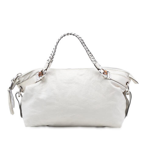 The Gucci Medium Leather Bamboo Bar Tote is a timeless designer handbag that combines elegance with everyday versatility. Crafted from high-quality leather, this sophisticated tote features braided leather straps, a secure top zip closure, and a spacious interior with zip and slip pockets to keep your essentials organized. Its refined silhouette and iconic Gucci appeal make it an excellent choice for anyone seeking luxury and contemporary style.<br /><br /> Designed for both fashion and functionality, this pre-owned Gucci tote offers ample space with dimensions of 10.63 x 16.93 x 5.91 inches, making it ideal for carrying your daily essentials with ease. The classic design pairs beautifully with both casual and polished looks, while the practical interior compartments add convenience to its elevated style. Whether you're heading to work, shopping, or meeting friends, this bag is perfect for everyday use.<br /><br /> This tote features a leather body, braided leather straps, a top zip closure, and interior zip and slip pockets. Condition Rating: B+. Comments: Exterior Back Creased. Exterior Bottom Creased. Exterior Front Creased. Exterior Side Loose Stiching. Hardware Practical Attachment Scratched. Zipper Scratched. Interior Lining Stained With Others. Inclusions: None. Model: Medium Leather Bamboo Bar Tote. Item# VRBZR3XP8MVHT6ZS. Pre-owned Gucci Medium Leather Bamboo Bar Tote Ladies VRBZR3XP8MVHT6ZS. This is a great opportunity to own an authentic handbag at a more accessible price.