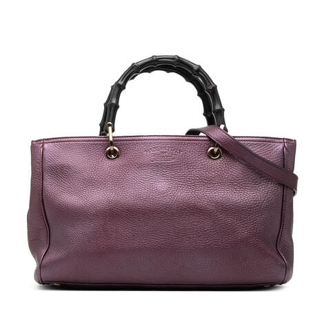 Pre-owned Gucci Medium Calfskin Bamboo Shopper Satchel in supple calfskin leather, featuring signature bamboo top handles, a detachable flat leather shoulder strap, an open top with magnetic snap closure, and interior zip and slip pockets for easy organization. Measuring 7.48 x 12.99 x 5.12 inches, this designer satchel offers a refined silhouette that blends iconic Gucci craftsmanship with luxury and contemporary style.<br /><br /> Designed for both fashion and functionality, this Gucci Bamboo Shopper Satchel is an elegant choice for carrying your daily essentials while elevating any wardrobe. The spacious interior, practical pocket layout, and versatile shoulder strap make it a stylish and convenient handbag that is perfect for everyday use.<br /><br /> Condition Rating: B+. This pre-owned Gucci handbag includes the shoulder strap and remains a desirable option for collectors and fashion lovers seeking authentic luxury for less. Pre-owned condition details include: exterior back scratched; exterior bottom scratched; exterior corners worn; exterior front scratched and stained with others; exterior handle/strap cracked and worn; exterior side worn; exterior top cracked, creased, and worn; hardware practical attachment rusty/tarnished and scratched; zipper rusty/tarnished and scratched; interior lining stained with others and discolored; interior pocket stained with others and discolored. This is a great opportunity to own an authentic handbag at a more accessible price.
