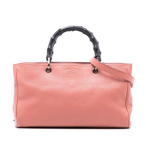 The pre-owned Gucci Medium Calfskin Bamboo Shopper Satchel is a timeless designer handbag that blends iconic craftsmanship with everyday elegance. Crafted from supple calfskin leather, this Gucci satchel features signature bamboo top handles, a detachable flat leather shoulder strap, and a spacious open top with magnetic closure for easy access to your essentials. With its refined silhouette and instantly recognizable details, this handbag is the perfect choice for anyone seeking luxury and contemporary style.<br /><br /> Designed for both fashion and functionality, this Gucci Bamboo Shopper Satchel offers a well-organized interior with zip and slip compartments, along with additional interior zip and slip pockets to keep your belongings secure and neatly arranged. Measuring 8.27 x 12.99 x 4.72 inches, it is an ideal size for carrying daily necessities while maintaining a polished, sophisticated look, making it perfect for everyday use.<br /><br /> This authentic pre-owned Gucci handbag includes the shoulder strap and is identified as Model: Medium Calfskin Bamboo Shopper Satchel, Item# S2NBAQT15MPDGMCD. Condition Rating: AB. Comments: Exterior Back Worn. Exterior Corners Worn. Exterior Front Worn. Exterior Handle/Strap Creased. Exterior Top Worn, Stained With Others. Hardware Closure Scratched. Hardware Practical Attachment Scratched. Zipper Scratched. Interior Lining Stained With Others. Interior Pocket Stained With Others. This is a great opportunity to own an authentic handbag at a more accessible price.