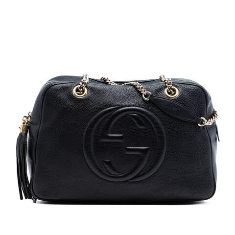 The pre-owned Gucci Leather Soho Chain Shoulder Bag is a timeless designer accessory that blends everyday practicality with elevated appeal. Crafted from leather and detailed with curb chain shoulder straps, this elegant shoulder bag features a top zip closure with a tassel zipper pull, along with interior zip and slip pockets for organized storage. With dimensions of 9.84 x 13.78 x 5.12 inches, it offers a spacious yet stylish silhouette that captures luxury and contemporary style.<br /><br /> Designed for both fashion and functionality, this authentic Gucci shoulder bag is an excellent choice for carrying your daily essentials in style. The refined design, signature details, and versatile shape make it easy to pair with both casual and polished looks, while the interior compartments help keep everything neatly in place. Whether you're heading to work, shopping, or meeting friends, this designer handbag is perfect for everyday use.<br /><br /> This pre-owned Gucci Leather Soho Chain Shoulder Bag is rated B+ and remains a desirable option for buyers seeking authentic luxury at a more attainable value. Condition details include: Exterior Front Worn. Hardware Practical Attachment Scratched. Interior Pocket Stained With Others. Exterior Corners Worn. Zipper Scratched. Exterior Handle/Strap Cut Stitching, Cracked. Exterior Top Stained With Others. Exterior Side Worn. Hardware Embellishment Scratched. Interior Lining Stained With Pen Mark, Stained With Others. Inclusions: None. Model: Leather Soho Chain Shoulder Bag. Item# RQQIIUL7XV7QR5HO. This is a great opportunity to own an authentic handbag at a more accessible price.