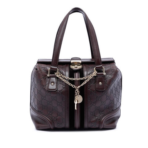 The pre-owned Gucci Guccissima Treasure Handbag is a timeless designer accessory that combines elegant craftsmanship with everyday versatility. Crafted with a refined leather body, this authentic Gucci handbag features flat leather straps, a structured top flap with a metal closure and key, and an interior zip pocket for added organization. With dimensions of 7.48 H x 9.06 W x 6.30 D inches, it offers a compact yet practical silhouette that reflects luxury and contemporary style.<br /><br /> Designed for both fashion and functionality, this Gucci Guccissima Treasure Handbag is an excellent choice for carrying your essentials in style. The interior zip pocket helps keep small items secure, while the classic flap design and signature detailing make it a sophisticated addition to any wardrobe. Whether paired with casual daytime looks or polished evening outfits, this authentic Gucci bag is perfect for everyday use.<br /><br /> This pre-owned Gucci ssima Treasure Handbag includes Key, Charm and remains a desirable option for collectors and fashion lovers seeking authentic designer value. Condition Rating: B+. Comments: Exterior Back Creased, Worn. Exterior Bottom Scratched. Exterior Corners Creased. Exterior Front Scratched, Creased, Worn. Exterior Handle/Strap Scratched, Worn. Exterior Side Scratched. Exterior Top Worn. Hardware Closure Scratched. Hardware Embellishment Scratched. Hardware Practical Attachment Scratched. Model: Guccissima Treasure Handbag. Item# AE7RHVRKGC4JXVOC. This is a great opportunity to own an authentic handbag at a more accessible price.
