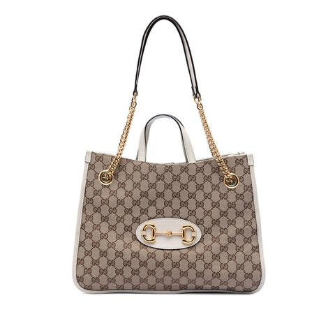 Pre-owned Gucci Medium GG Canvas Horsebit 1955 Chain Tote in the iconic GG canvas showcases a refined blend of signature design and timeless sophistication. Crafted with a durable canvas body, elegant leather trim, flat leather handles, and chain straps with a leather guard, this designer satchel delivers standout appeal with everyday versatility. The open top with a magnetic snap closure and the classic Horsebit detail complete a handbag that embodies luxury and contemporary style.<br /><br /> Designed for both fashion and functionality, this Gucci Medium GG Canvas Horsebit 1955 Chain Tote offers a spacious interior with zip and slip pockets to help keep your essentials organized throughout the day. Measuring approximately 9.84 x 13.78 x 4.72 inches, it is a practical yet stylish choice for work, shopping, or daily outings, and it also includes a shoulder strap for added carrying convenience, making it perfect for everyday use.<br /><br /> This authentic pre-owned Gucci handbag is a smart choice for buyers seeking designer style at a more attainable value. Comments: Exterior Back Stained With Others. Exterior Bottom Stained With Others. Exterior Corners Worn. Exterior Handle/Strap Worn. Exterior Top Stained With Others. Hardware Practical Attachment Scratched. Zipper Scratched. Interior Lining Stained With Others. Interior Pocket Stained With Others. Inclusions: Shoulder Strap Model: Medium GG Canvas Horsebit 1955 Chain Tote Item# YWP4Q5KGTP0VW9DV. Rating: B+ Condition: Pre-owned. This is a great opportunity to own an authentic handbag at a more accessible price.