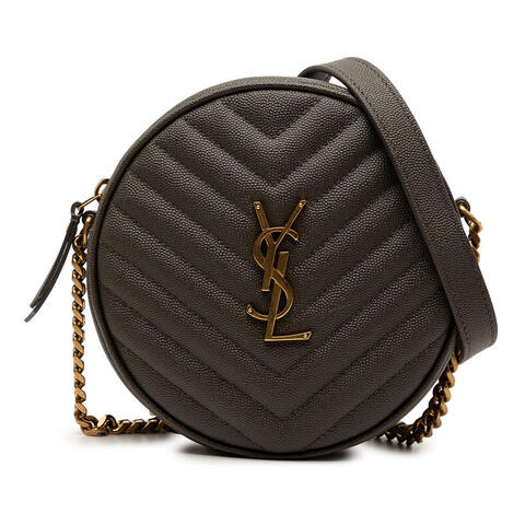 The Saint Laurent Grain De Poudre Chevron Round Vinyle Camera Bag is a chic and timeless crossbody crafted from grained quilted leather, offering a refined designer look in a compact silhouette. Featuring a chain-link strap with a leather guard, a secure top zip closure, and an interior slip pocket, this elegant handbag combines practicality with elevated appeal, making it a standout choice for any wardrobe with luxury and contemporary style.<br /><br /> Designed for both fashion and functionality, this pre-owned Saint Laurent camera bag is ideal for carrying your daily essentials while maintaining a polished, sophisticated look. Its versatile round shape, quality leather construction, and signature quilted finish make it easy to pair with both casual and dressy outfits, making it perfect for everyday use.<br /><br /> This authentic pre-owned Saint Laurent handbag measures approximately 6.69 x 6.69 x 1.97 inches and is offered in Condition Rating: AB. Comments: Exterior Front Stained With Others. Exterior Handle/Strap Worn, Creased, Stained With Others. Exterior Top Stained With Others. Hardware Embellishment Scratched. Zipper Scratched. Interior Lining Stained With Others. Interior Pocket Stained With Others. Inclusions: None. Model: Grain De Poudre Chevron Round Vinyle Camera Bag. Item# 284IC8N7AYXGWXRX. This is a great opportunity to own an authentic handbag at a more accessible price.