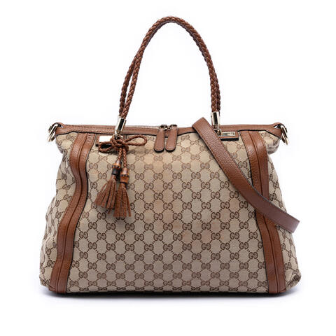 The Gucci GG Canvas Bella Convertible Tote is a stylish and versatile handbag crafted with a durable canvas body and elegant leather trim. It features braided leather handles, a detachable flat leather shoulder strap, a secure top zip closure, and convenient interior zip and slip pockets for easy organization. With dimensions of 12.80 x 14.17 x 4.33 inches, this designer tote offers a spacious yet refined silhouette that blends luxury and contemporary style.<br /><br /> Designed for both fashion and functionality, this pre-owned Gucci Bella satchel is an excellent choice for anyone seeking a chic designer bag that transitions effortlessly from day to night. The included shoulder strap adds carrying versatility, while the thoughtfully designed interior helps keep essentials neatly in place. Its timeless GG canvas design and practical features make it perfect for everyday use.<br /><br /> Pre-owned Gucci GG Canvas Bella Convertible Tote Ladies 5KUOSWWPQTVOXCAK. Model: GG Canvas Bella Convertible Tote. Item# 5KUOSWWPQTVOXCAK. Inclusions: Shoulder Strap. Condition Rating: B+. Comments: Exterior Corners Worn. Exterior Front Stained With Others. Exterior Handle/Strap Worn. Exterior Side Scratched. Exterior Top Worn. Hardware Practical Attachment Scratched. Zipper Scratched. Interior Lining Stained With Others. This is a great opportunity to own an authentic handbag at a more accessible price.