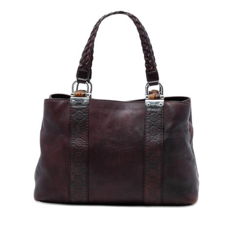 The pre-owned Gucci Guccissima Trimmed Leather Bamboo Libeccio Tote is a sophisticated designer handbag that blends timeless elegance with everyday versatility. Crafted with a leather body and embossed leather trim, this stylish tote also features woven leather shoulder straps, an open top, and a spacious interior with a zip compartment, plus zip and slip pockets for organized storage. With dimensions of 10.63 x 15.35 x 5.51 inches, it offers ample room for your daily essentials while showcasing luxury and contemporary style.<br /><br /> Designed for both fashion and functionality, this Gucci tote is an excellent choice for women who want a refined handbag that transitions effortlessly from day to evening. The iconic design, premium leather detailing, and practical interior layout make it both fashionable and useful, while the roomy silhouette provides the space needed for essentials, work items, or personal accessories. Its classic Gucci appeal and versatile structure make it perfect for everyday use.<br /><br /> Model: Guccissima Trimmed Leather Bamboo Libeccio Tote. Item# 2TWX2OS2PESFLGNB. Inclusions: None. Condition Rating: B+. Comments: Exterior Back Worn, Creased. Exterior Bottom Worn. Exterior Corners Worn. Exterior Front Worn, Creased. Exterior Handle/Strap Split, Worn. Exterior Side Worn. Exterior Top Worn. Hardware Practical Attachment Scratched. Zipper Scratched. Interior Lining Worn. Interior Pocket Worn. This pre-owned Gucci handbag remains a desirable luxury piece for any collection, offering designer style at a more approachable value. This is a great opportunity to own an authentic handbag at a more accessible price.