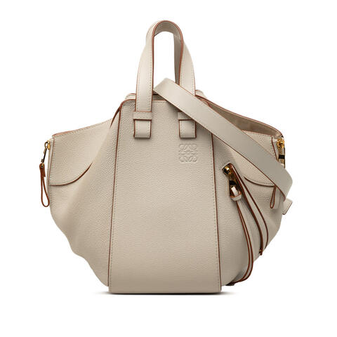 Pre-owned Loewe Medium Grained Calfskin Hammock Satchel crafted in grained calfskin leather, featuring a distinctive silhouette that blends modern design with timeless appeal. The Hammock features a leather body, flat leather handles, a detachable flat leather strap, an open top with lobster claw clasp closure, side zipper extenders, an exterior zip pocket, and interior slip pockets. With dimensions of 9.06 x 11.02 x 9.45 inches, this designer handbag offers a spacious yet elegant profile that reflects luxury and contemporary style.<br /><br /> Designed for both fashion and functionality, this Loewe Hammock Satchel offers versatile carrying options with its top handles and detachable shoulder strap, making it easy to style for day-to-night wear. The thoughtfully designed interior and exterior pockets help keep essentials organized, while the premium grained calfskin leather adds durability and sophistication. Complete with a dust bag and shoulder strap, this handbag is a refined choice for collectors and style-conscious shoppers alike, perfect for everyday use.<br /><br /> Condition Rating: AB. Comments: Exterior Bottom Scratched. Exterior Handle/Strap Creased, Stained With Others. Exterior Top Cracked. Hardware Closure Scratched. Zipper Scratched. Interior Lining Stained With Others. Inclusions: Dust bag, Shoulder Strap. Model: Medium Grained Calfskin Hammock Satchel. Item# Y36VLWPC9QPTNOX6. This pre-owned Loewe handbag remains a desirable luxury piece for those seeking authentic designer fashion with character and value. This is a great opportunity to own an authentic handbag at a more accessible price.