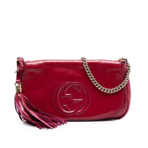Pre-owned Gucci Medium Patent Soho Chain Flap Crossbody Ladies PH5YXX7IPFF1HS3A is a chic designer handbag crafted in glossy patent leather with a refined chain link shoulder strap. The front flap with magnetic snap closure opens to a thoughtfully organized interior with zip and slip pockets, making it a stylish and practical choice for carrying your essentials. With its signature Gucci appeal and polished silhouette, this crossbody bag offers luxury and contemporary style.<br /><br /> Designed for both fashion and functionality, this Gucci Medium Patent Soho Chain Flap Crossbody is ideal for day-to-night wear. Its compact dimensions of 5.91 x 10.24 x 1.97 inches make it easy to carry while still providing enough room for your daily necessities, and the included charm adds an extra touch of designer character. Whether paired with casual looks or elevated outfits, this handbag is perfect for everyday use.<br /><br /> Condition Rating: B+. Comments: Exterior Back Stained With Others. Exterior Corners Worn. Exterior Front Stained With Others, Split. Exterior Side Worn. Exterior Top Stained With Others. Hardware Closure Scratched. Hardware Practical Attachment Scratched. Zipper Scratched. Interior Lining Stained With Transfer of Color, Worn, Stained With Others. Interior Pocket Stained With Others. Inclusions: Charm. Model: Medium Patent Soho Chain Flap Crossbody. Item# PH5YXX7IPFF1HS3A. This pre-owned Gucci handbag is a stylish option for buyers seeking authentic designer fashion with character and value. This is a great opportunity to own an authentic handbag at a more accessible price.