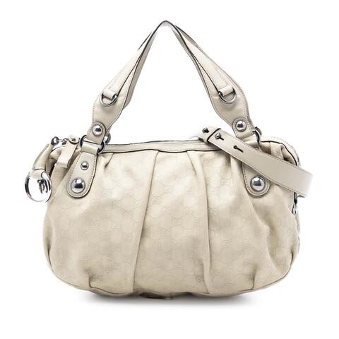 The Gucci Guccissima Icon Bit Satchel is a sophisticated designer handbag crafted from luxurious leather and finished with elegant silver-tone hardware. This stylish satchel features flat leather handles, a detachable and adjustable chain strap, a secure top zip closure, and practical interior zip and slip pockets, offering both timeless appeal and everyday versatility. With dimensions of 10.24 x 14.96 x 4.33 inches, it is a chic and functional choice for anyone seeking luxury and contemporary style.<br /><br /> Designed for both fashion and functionality, this pre-owned Gucci satchel offers ample space for daily essentials while maintaining a polished and refined silhouette. The combination of leather construction, signature detailing, and versatile carrying options makes it an ideal accessory for work, errands, or casual outings. Its classic design and practical interior organization make it perfect for everyday use.<br /><br /> This pre-owned Gucci Guccissima Icon Bit Satchel includes the shoulder strap and remains a desirable option for collectors and fashion lovers seeking authentic designer style. Condition Rating: B+. Comments: Exterior Back Worn. Exterior Bottom Worn, Stained With Others. Exterior Corners Worn. Exterior Front Worn. Exterior Handle/Strap Worn. Exterior Side Stained With Transfer of Color, Worn. Exterior Top Stained With Others, Worn. Hardware Practical Attachment Scratched. Zipper Scratched. Interior Lining Stained With Transfer of Color, Stained With Others, Worn. This is a great opportunity to own an authentic handbag at a more accessible price.