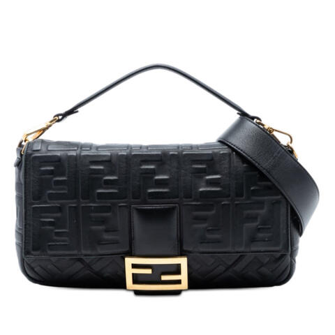 The Fendi Large Zucca Embossed Leather Baguette Satchel is a timeless designer handbag that blends iconic craftsmanship with everyday elegance. Crafted from embossed leather, this sophisticated satchel features a structured silhouette, a front flap with magnetic snap closure, and refined detailing that highlights Fendis signature aesthetic. With its removable flat leather handle and detachable strap, it offers versatile styling for both hand carry and shoulder wear, making it a standout piece that captures luxury and contemporary style.<br /><br /> Designed for both fashion and functionality, this pre-owned Fendi Baguette satchel offers a well-organized interior with a zip pocket to keep essentials secure while maintaining a sleek and polished profile. The spacious design, paired with its practical removable shoulder strap, makes it easy to transition from day to evening wear. Whether you're adding to a designer handbag collection or searching for a chic statement accessory, this satchel is a stylish and versatile choice that is perfect for everyday use.<br /><br /> This authentic Fendi Large Zucca Embossed Leather Baguette Satchel is a desirable luxury find for buyers seeking premium designer style at a better value. Model: Large Zucca Embossed Leather Baguette Satchel. Item# QZBCKXUZ8292QZIB. Inclusions: Shoulder Strap. Condition Rating: B+. Comments: Exterior Top Worn. Exterior Corners Worn. Exterior Handle/Strap Stained With Others, Worn. Hardware Closure Scratched. Interior Lining Creased. Hardware Practical Attachment Scratched. Exterior Back Creased, Worn. Exterior Front Worn. Exterior Side Worn. This is a great opportunity to own an authentic handbag at a more accessible price.