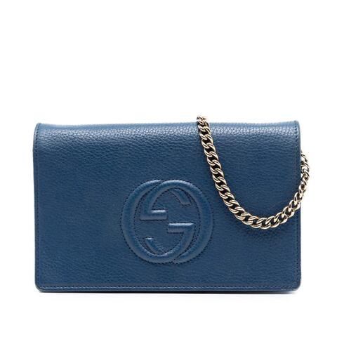 The Gucci Pebbled Calfskin Soho Wallet On Chain is a timeless crossbody bag crafted from luxurious pebbled leather, featuring a sleek curb chain shoulder strap with a leather guard for added comfort. Its elegant front flap with snap button closure opens to a thoughtfully organized interior with zip and slip pockets, making it easy to keep your essentials secure and within reach. Compact yet refined, this designer handbag is an excellent choice for anyone seeking luxury and contemporary style.<br /><br /> Designed for both fashion and functionality, this pre-owned Gucci Soho Wallet On Chain offers the versatility you need for day-to-night wear. With dimensions of 5.12 x 7.87 x 1.77 inches, it is perfectly sized to carry your small essentials without feeling bulky, while the signature Gucci design adds instant sophistication to any outfit. Whether paired with casual looks or dressed-up ensembles, this authentic Gucci crossbody bag is perfect for everyday use.<br /><br /> This pre-owned Gucci Pebbled Calfskin Soho Wallet On Chain, model 2NR7IKRCQDKJLMF8, is a stylish and smart choice for luxury lovers looking for authentic designer value. Condition Rating: AB. Comments: Exterior Back Worn. Exterior Corners Worn. Exterior Front Scratched, Worn. Exterior Side Worn. Hardware Closure Scratched. Hardware Practical Attachment Scratched. Zipper Scratched. Interior Lining Creased, Stained With Others. Inclusions: None. This is a great opportunity to own an authentic handbag at a more accessible price.