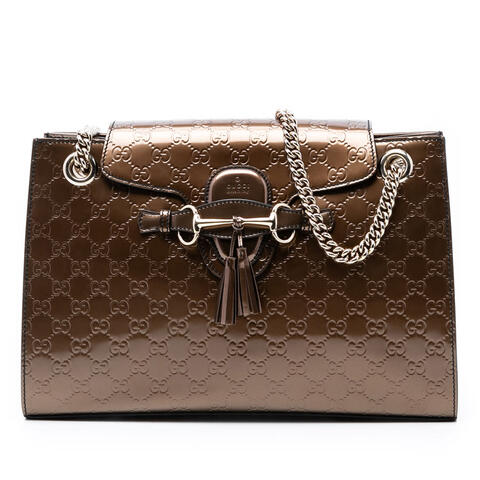 The Gucci Large Guccissima Emily Shoulder Bag is a timeless designer handbag crafted from luxurious leather with the brands signature refined detailing. Featuring elegant chain straps with flat leather shoulder guards, a front flap with a slip-through closure, and a spacious silhouette, this bag offers a sophisticated look that complements both casual and elevated wardrobes. With dimensions of 9.84 x 13.58 x 3.15 inches, it is a stylish and practical choice for anyone who appreciates luxury and contemporary style.<br /><br /> Designed for both fashion and functionality, this pre-owned Gucci Emily shoulder bag includes interior zip and open pockets to help keep your essentials organized throughout the day. The roomy interior and comfortable shoulder straps make it an ideal companion for work, shopping, travel, or daily errands, while the iconic Gucci design adds undeniable designer appeal to any outfit. Its versatile structure and chic finish make it perfect for everyday use.<br /><br /> This pre-owned Gucci Large Guccissima Emily Shoulder Bag is a smart choice for buyers seeking authentic luxury with lasting style and value. Condition Rating: AB. Comments: Exterior Back Stained With Others. Exterior Bottom Creased, Stained With Others. Exterior Corners Worn. Exterior Front Stained With Others. Exterior Handle/Strap Creased. Hardware Practical Attachment Scratched. Zipper Scratched. Interior Lining Creased. Interior Pocket Stained With Others. Inclusions: None. Model: Large Guccissima Emily Shoulder Bag. Item# 2YVFBGSUDP0866K1. This is a great opportunity to own an authentic handbag at a more accessible price.