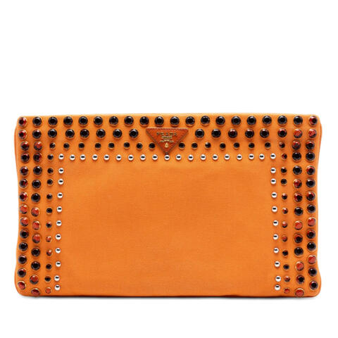 The Prada Canvas Canapa Bijoux Clutch is a chic and versatile accessory that combines iconic design with practical elegance. Crafted from durable canvas with striking studded details, this designer clutch features a flat back handle, a secure top zip closure, and interior zip and slip pockets for easy organization. Its compact yet functional silhouette makes it an excellent choice for carrying essentials in luxury and contemporary style.<br /><br /> Designed for both fashion and functionality, this Prada clutch offers a stylish way to elevate your day-to-night wardrobe. The canvas construction provides a relaxed yet refined look, while the embellished hardware adds a distinctive touch that reflects Pradas signature sophistication. Whether paired with casual outfits or dressed up for an evening out, this clutch is perfect for everyday use.<br /><br /> This pre-owned Prada Canvas Canapa Bijoux Clutch measures approximately 8.46 inches high, 13.98 inches wide, and 0.39 inches deep. Condition Rating: B+. Comments: Exterior Back Worn. Exterior Corners Worn. Exterior Side Worn. Exterior Top Worn. Hardware Embellishment Scratched. Zipper Scratched. Interior Lining Stained With Others. Inclusions: None. Model: Canvas Canapa Bijoux Clutch. Item# T0H8P8GPX5MWS836. Pre-owned Prada Canvas Canapa Bijoux Clutch Ladies T0H8P8GPX5MWS836. This is a great opportunity to own an authentic handbag at a more accessible price.