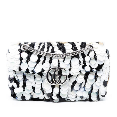The Gucci Medium GG Marmont Sequin Embellished Leather Shoulder Bag is a standout designer accessory that brings glamour and sophistication to any wardrobe. Crafted with a sequined leather body, this elegant shoulder bag features a sleek front flap with a push-lock closure and the iconic GG Marmont styling that Gucci lovers adore. Its refined silhouette and eye-catching finish make it an exceptional choice for day-to-night wear, blending luxury and contemporary style.<br /><br /> Designed for both fashion and functionality, this pre-owned Gucci shoulder bag includes a curb chain shoulder strap for comfortable wear and an interior zip pocket to help keep essentials organized. Measuring 6.50 x 9.84 x 2.56 inches, it offers a compact yet practical size for carrying your daily necessities while elevating your look with unmistakable designer appeal. With its versatile design and timeless character, this bag is perfect for everyday use.<br /><br /> Pre-owned Gucci Medium GG Marmont Sequin Embellished Leather Shoulder Bag Ladies E5GNUMAS3KLRKZIE. Model: Medium GG Marmont Sequin Embellished Leather Shoulder Bag. Item# E5GNUMAS3KLRKZIE. Inclusions: Dust bag. Condition Rating: AB. Comments: Exterior Handle/Strap Creased. Hardware Closure Scratched. Hardware Practical Attachment Scratched. Zipper Scratched. Interior Lining Stained With Transfer of Color, Stained With Others. Interior Pocket Stained With Others. This is a great opportunity to own an authentic handbag at a more accessible price.