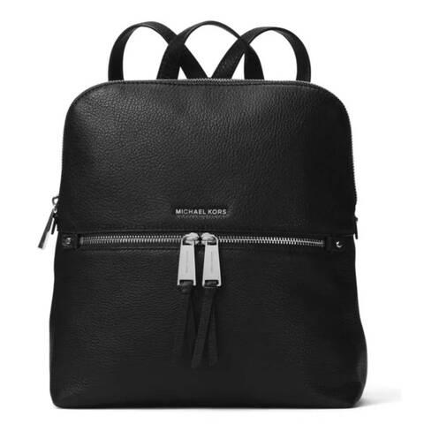 Michael Kors Ladies Backpack. SKU: 30H6SEZB2L-001. Color: Black. The Michael Kors Rhea Medium Slim Leather Backpack is a sleek, everyday essential with a clean, modern profile. Crafted from smooth leather and finished with silver-tone hardware, it offers a polished yet practical design perfect for casual, on-the-go wear. Product Details: 10 W x 11.75 H x 4.5 D. Top zip closure. Exterior: 1 front zip pocket. Interior: 1 padded pocket, 1 zip pocket, 1 key fob. Top handle; adjustable shoulder straps.