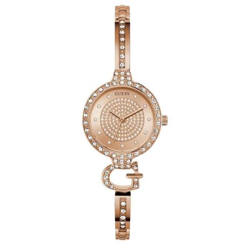 Rose gold-tone stainless steel case and bracelet. Fixed rose gold-tone stainless steel bezel. Rose gold-tone dial with rose gold-tone hands and index hour markers. Dial Type: Analog. Quartz movement. Scratch resistant mineral crystal. Pull / push crown. Round case shape, case size: 28 mm. Band width: 15 mm, band length: 7.5 inches. Jewelry clasp. Water resistant at 30 meters / 100 feet. Functions: hour, minute, second. Giselle Series. Fashion watch style. Guess Giselle Quartz Rose Gold Dial Ladies Watch GW0929L3.