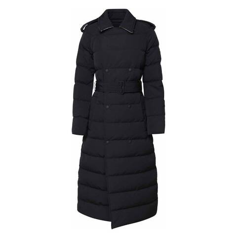 Burberry Ladies Outerwear. Fashion category: Coats & Jackets. SKU: 8096909. Color: Black/Sand Ip Check. Burberry Long Double-Breasted Down Puffer Coat. This puffer coat is filled with insulating down feathers and features a quilted design for warmth and structure. It is styled with a double-breasted press-stud fastening, a Nova Checklined spread collar, and a throat latch, complemented by epaulettes and long sleeves. Finished with an applique logo, a detachable waist belt, two press-stud side pockets, and a straight hem, this coat combines functional details with signature Burberry style. Outer: 100% Polyamide (Nylon).