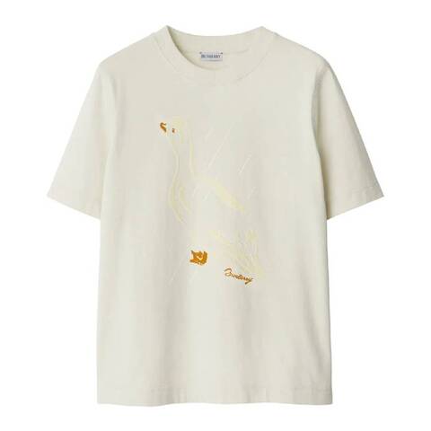 Burberry Ladies Tops. Fashion category: T-Shirts & Henleys. SKU: 8093587. Color: Chalk. Burberry Duck Graphic Print Cotton T Shirt. This shirt features a soft jersey texture, highlighted by a striking graphic print on the front, a classic crew neck, short sleeves, and a clean straight hem, effortlessly blending modern design with refined simplicity. 100% Cotton.