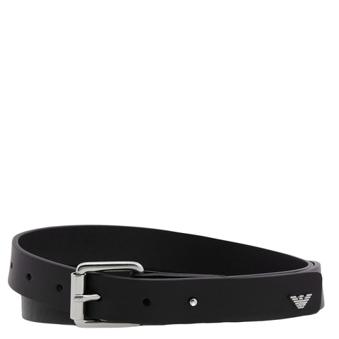 Emporio Armani Mens Belts. Fashion category: Belts. SKU: EM001640-AF14706-UC001. Color: Black Beauty. Emporio Armani Eagle Plate Smooth Leather Belt. Crafted in Italy from bovine leather, this belt features a smooth finish and is adorned with an iconic contoured eagle micro plate. 100% Bovine Leather. Made in Italy.