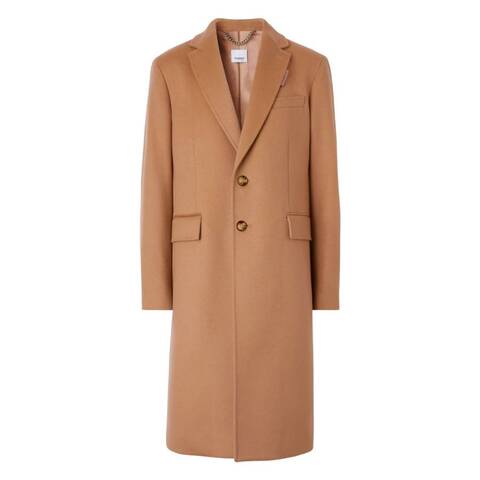 Burberry Mens Outerwear. Fashion category: Coats & Jackets. SKU: 8058261. Color: Camel. Burberry Callen Wool Cashmere Single-Breasted Coat. This single-breasted coat is crafted from a refined wool-cashmere blend for a soft yet structured finish. It features a distinctive poppable collar in Burberry check, adding a signature contrast detail. Designed with notched lapels, long sleeves, and a front button closure, it is completed with a chest welt pocket, dart detailing, and two front flap pockets for a clean tailored look. 95% Wool, 5% Cashmere. Made in Romania.