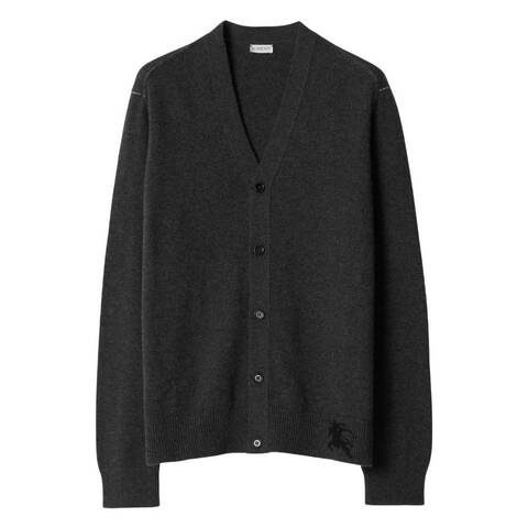 Burberry Mens Tops. Fashion category: Cardigans & Sweaters. SKU: 8081159. Color: Dark Grey Melange. Burberry EKD Embroidered Cashmere Cardigan. This cardigan is crafted from cashmere with a fine-knit melange effect and features intarsia knitting and EKD logo embroidery. It has a deep V-neck, button-front closure, and long sleeves with ribbed cuffs and hem for a comfortable and stylish fit. Material: 100% Cashmere.