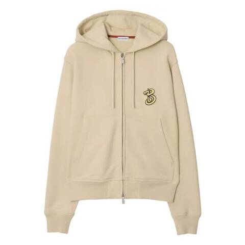 Burberry Ladies Tops. Fashion category: Hoodies & Sweatshirts. SKU: 8101405. Color: Nutmeg. Burberry Womens Snake Embroidered Hoodie. Burberry hoodie crafted from cotton jersey with a subtle textured finish. Designed with a drawstring hood and two-way zip closure, it features long sleeves, ribbed cuffs and hem, and two side pouch pockets for everyday practicality. Finished with soft French terry lining and an embroidered snake logo at the chest. 100% Cotton.