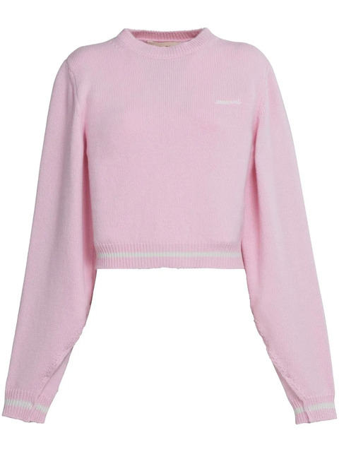 pink/white virgin wool knitted construction embroidered logo at the chest striped tipping ribbed edge crew neck long sleeves straight hem