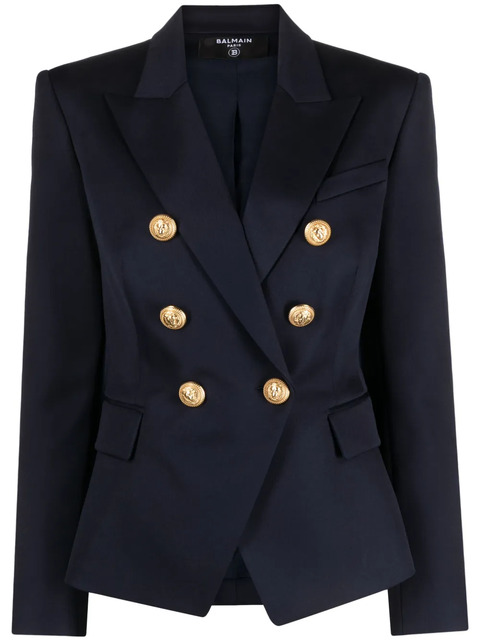 navy blue wool embossed gold-tone buttons peak lapels double-breasted button fastening fitted waistline long sleeves chest welt pocket two front flap pockets