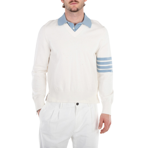 Thom Browne Mens Jersey 4-Bar V Neck Polo Pullover in White, Brand Size 1 (Small) - MKP115A Y3036 100 (LPN4614)