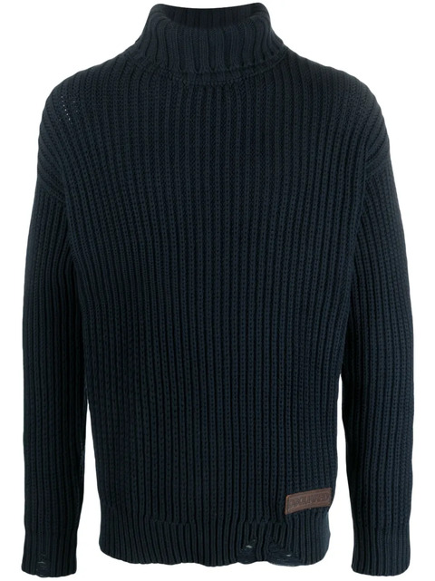 navy blue cotton blend chunky knit distressed finish logo patch to the side roll neck long sleeves ribbed cuffs and hem