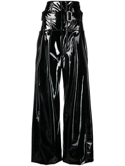 black high-shine finish high-waisted paperbag waist belted waist belt loops wide leg