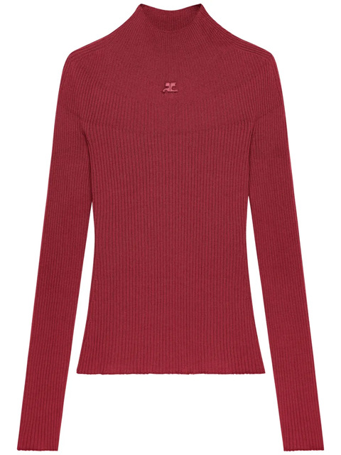 dark red cotton-merino wool blend knitted construction logo patch to the front seamless mock neck long sleeves straight hem