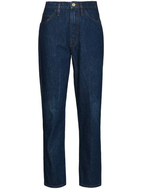 blue cotton high waist belt loops classic five pockets straight leg ankle length