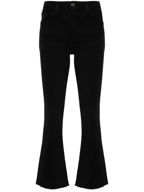 black cotton blend denim belt loops classic five pockets raw-cut edge high-rise bootcut cropped leg front button and zip fastening