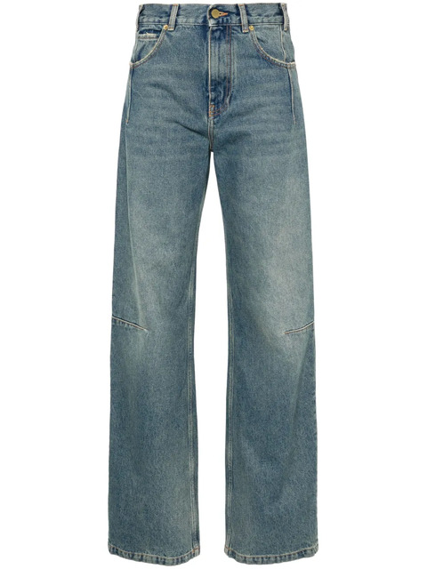 medium blue cotton washed denim distressed effect concealed zip-fly and button fastening classic five pockets rivet detailing dart detailing whiskering effect at the thighs logo patch to the rear full-length