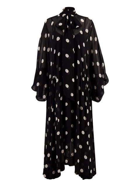 black white polka dot pattern pussy-bow collar long sleeves asymmetric hem semi-sheer finish
