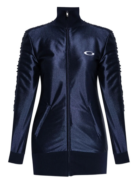 Navy blue dress featuring a front zip fastening. Includes ruched detail accents and two side welt pockets. Logo detail is present on the garment. Constructed with long sleeves.