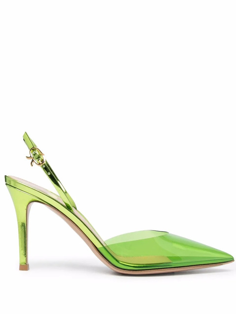 kiwi green leather transparent design pointed toe signature Ribbon buckle fastening slingback strap 85mm stiletto heel branded leather insole