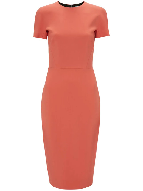 peach orange crepe texture round neck dart detailing at the skirt fitted waistline exposed rear zip fastening short sleeves mid-length