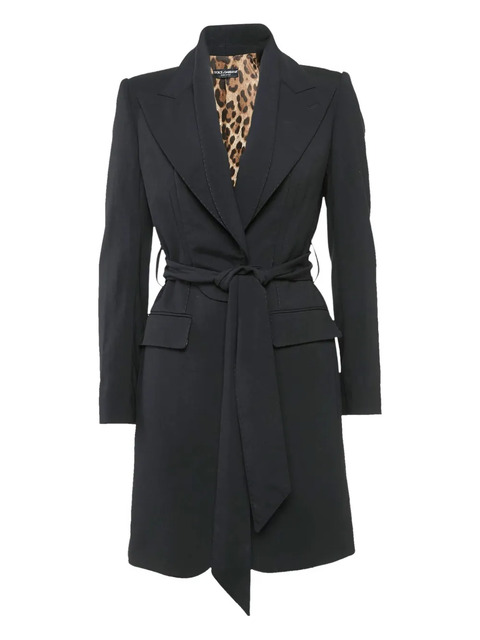 black single-breasted design belted waist stretch-virgin wool material leopard-print lining