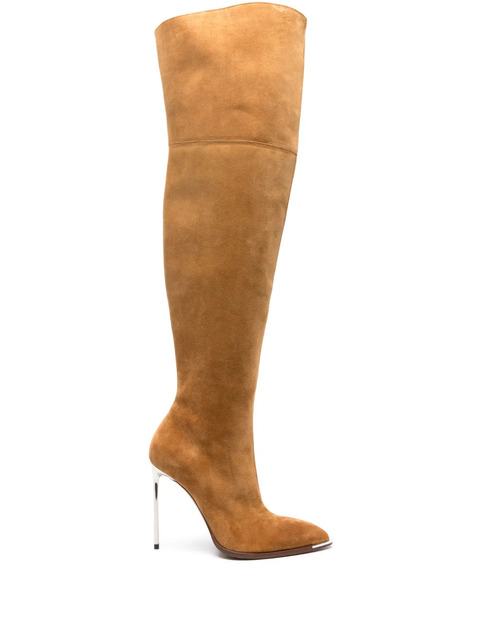 caramel brown calf suede pointed toe above-knee length side zip fastening branded leather insole leather sole 105mm high stiletto heel