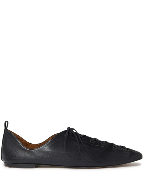 black faux leather front lace-up fastening pointed toe pull-tab at the heel low stacked heel rubber sole