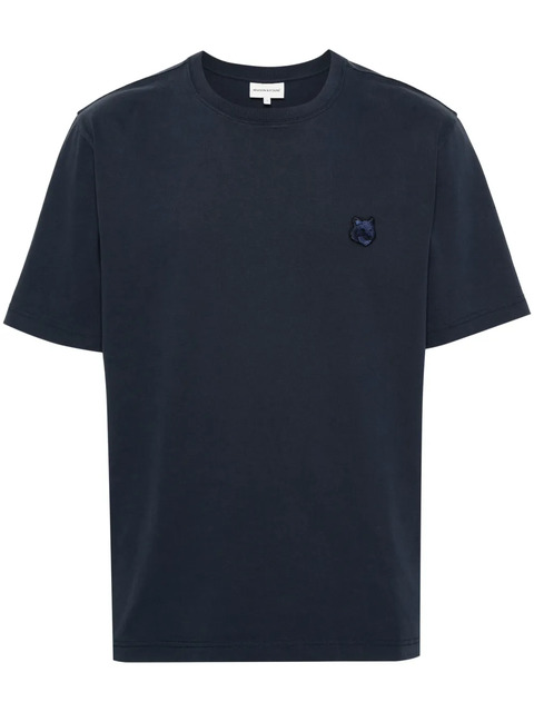 Periwinkle blue cotton jersey texture. Ribbed crew neck collar. Short sleeves. Features a Maison Kitsuné "Bold Fox Head" patch on the chest. Straight hem finish.