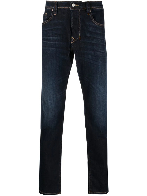 indigo blue stretch-cotton tonal stitching logo patch to the rear mid-rise belt loops concealed front fastening tapered leg