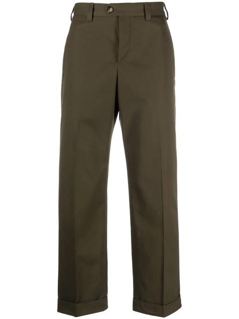 khaki green straight leg pressed crease belt loops off-centre front button fastening two side inset pockets two rear flap pockets