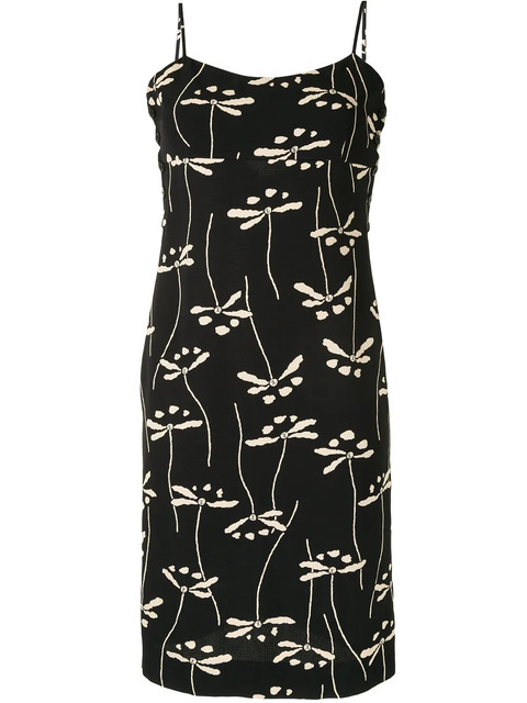 circa 1998 black all-over floral print empire line V-neck concealed rear fastening spaghetti straps knee-length Please be mindful that this piece has led a previous life, and may tell its story through minor imperfection.